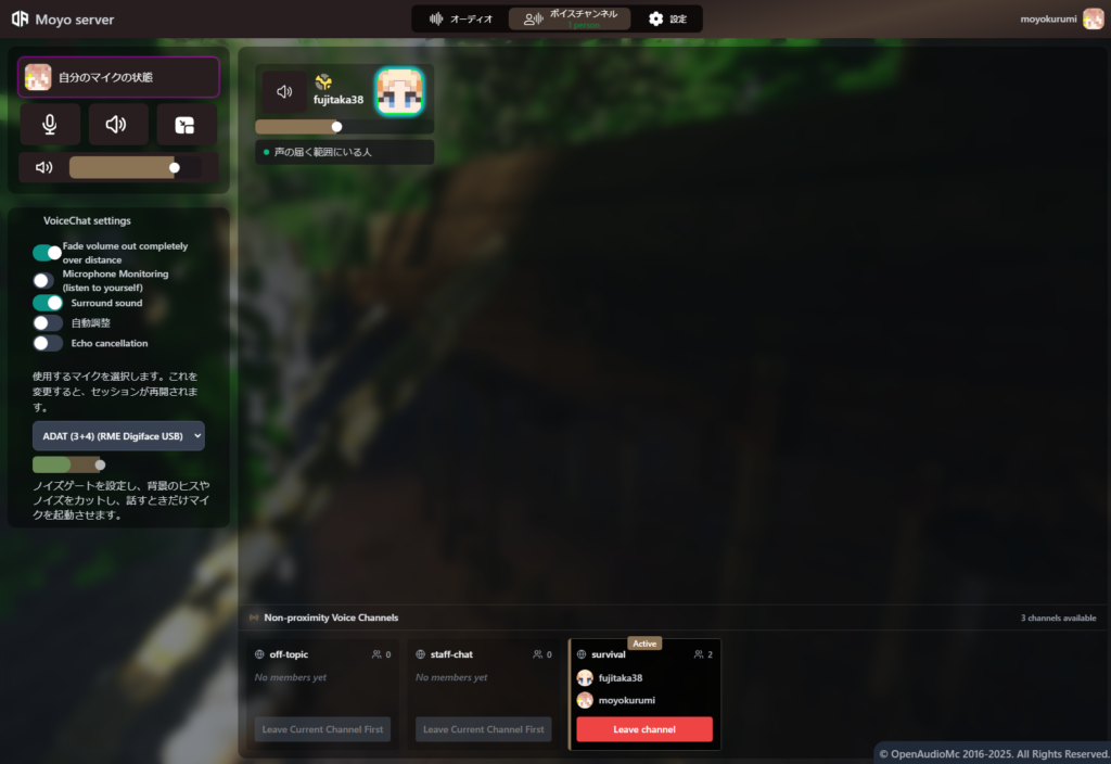 画面中央にはマイクラ内で近くにいるプレイヤーが、下部にはボイスチャット部屋が表示されます。